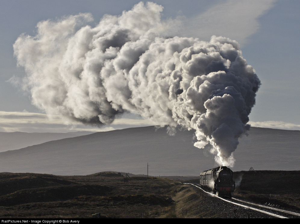| In the wilds of Rannoch Moor between Rannoch and Corrour, 'Black Five' 44871 peforms in perfect light, doing an almost perfect recreation of a Glasgow Queen St to Fort William train in the early 1960s. Part of the annual West Highland photo charter weekend, and some of the the best weather I have ever experienced in Western Scotland. |
