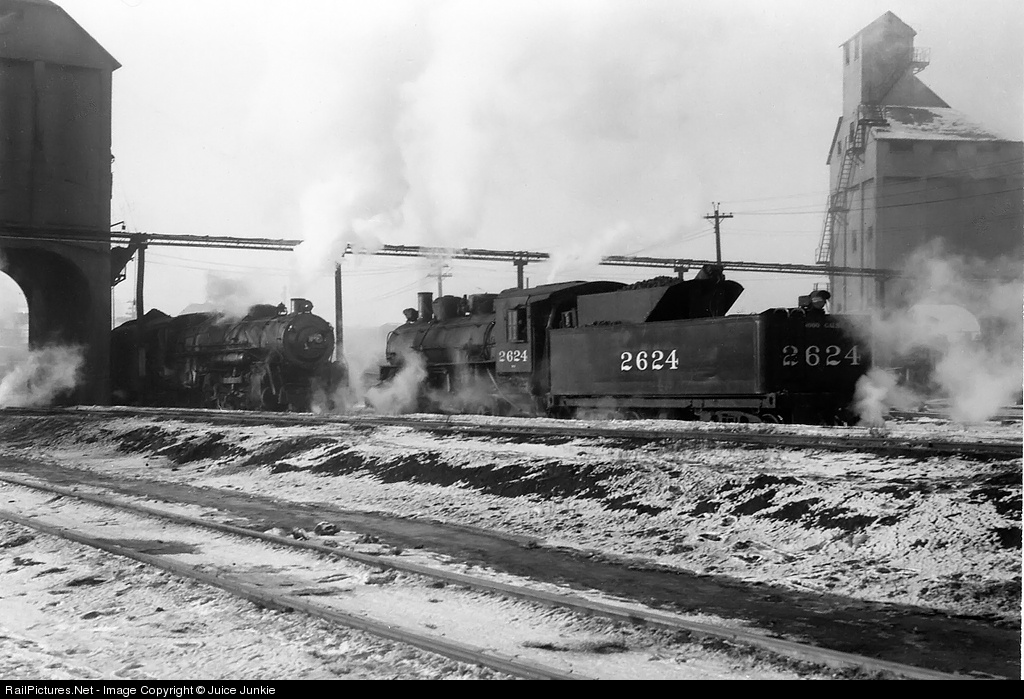 | As 1956 arrived it became obvious that the end of steam in Chicagoland was getting ever closer. Some railroads were already dieselized while others used steam rarely and were therefore hard to photograph. We decided to visit the C&NW facilities at 40th Street in Chicago, home of the commuter fleet of E class pacifics. We made our trip early in the New Year on a cold snowy day. C&NW M-3 0-6-0 2624 and a pacific await service at the coaling tower. |