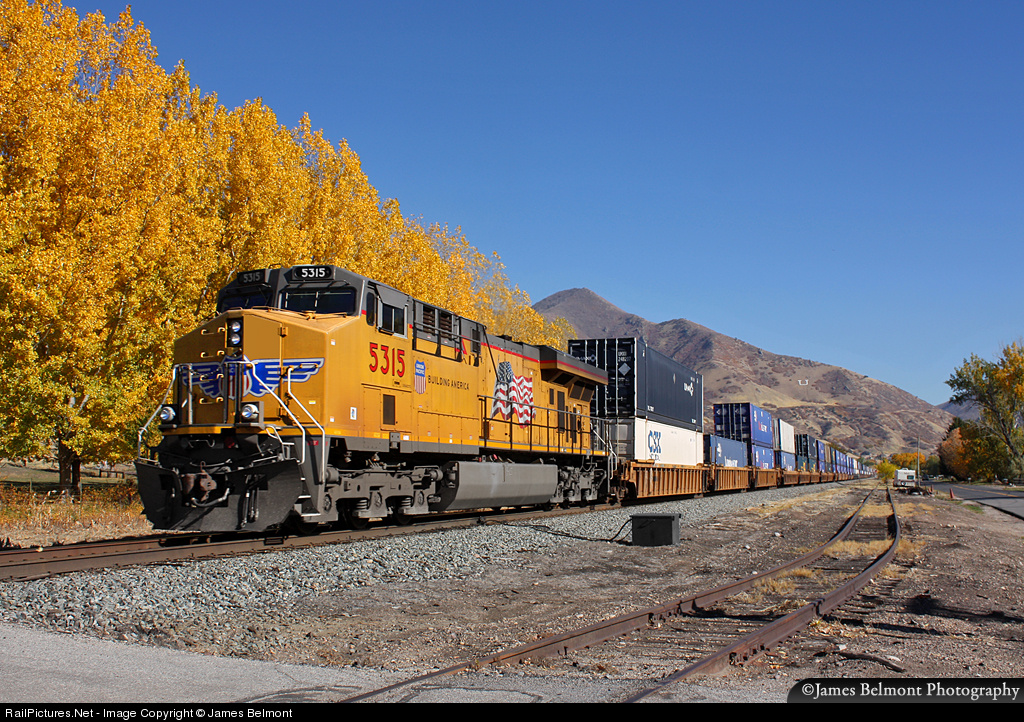 Golden autumn leaves line the right of way of Union Pacific's Evanston Subdivision in tiny rural hamlet of Uintah, Utah. UP dispatcher 6 has lined a short 1x1 stack train east up the steeper gradient of main #2 between CP East Riverdale and CP Strawberry.