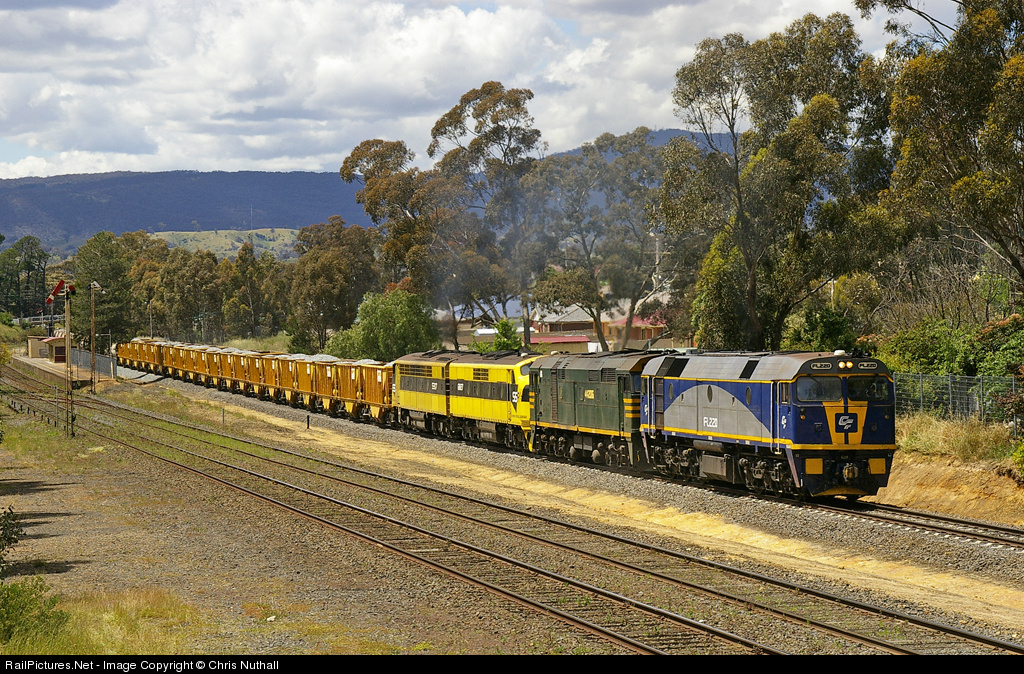 After a week of ballasting at Kilmore East using SSR's GM27 and S317, a double train was run from the ballast pile at Albury to the work site on the final day, using hired CFCLA FL220 and 44206 in addition to the GM and S class. The 3,000+ tonne train passes through Broadford, just north of Kilmore East, during the early afternoon. FL220 was originally numbered 42220 and was the demonstrator for Super Series equipment in Australia from the early 1980s