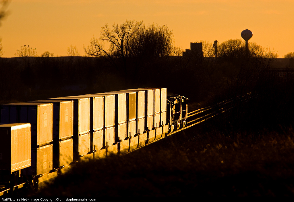 | After shooting the train heading into the sun and getting glared by the lead engine so bad it looked horrible, I was walking back to the car reviewing the shot when I looked up and saw this terrific glint shot. With minutes until darkness, the low sun angle lights up the rails and train while giving a great shadow effect on everything else. |