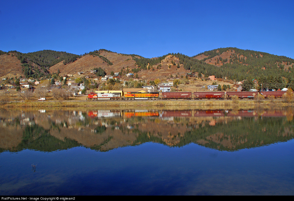 On what was a magnificient Saturday in Colorado BNSF 4701 with a loaded grain train in tow crests the Palmer Divide at Palmer Lake, CO and provides a nice reflection in the still, windless waters of, what else, Palmer Lake.