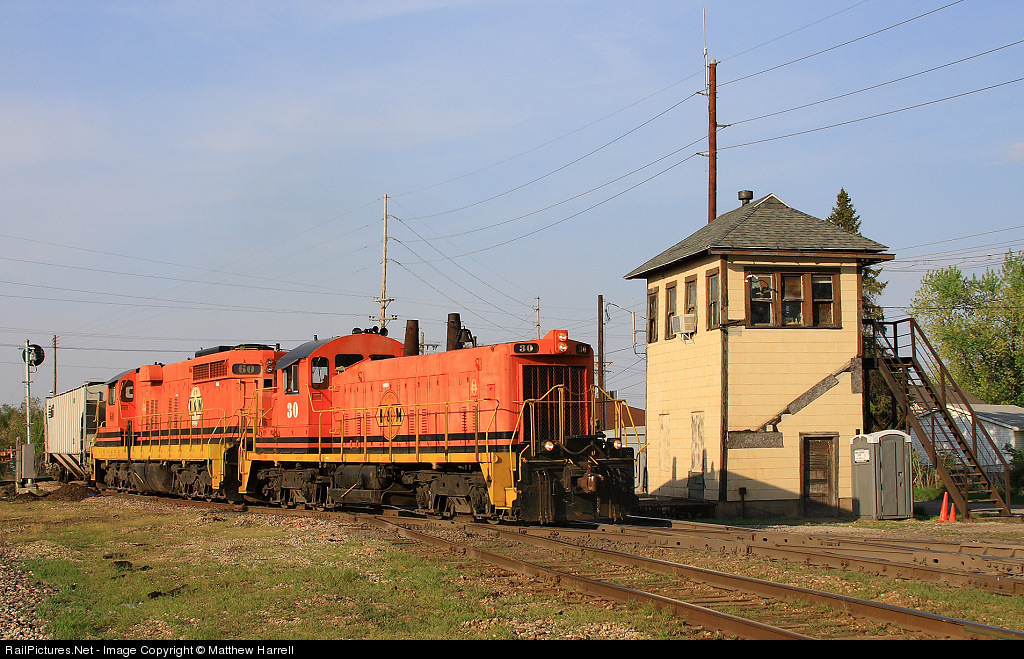| Classic Tower/Classic Power: Two of I&M's classic locomotives, RS1325 30 and SD18 60, pass Ridgely Tower with a southbound Havana Turn. |