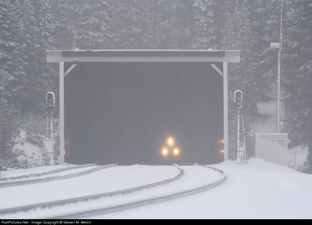 | With four inches of Sierra Cement already on the ground, more snow continues to fall while a Westbound stack train prepares to emerge from the ten thousand foot Tunnel 41. |