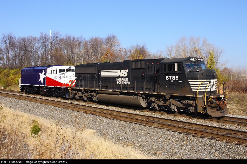 Former Conrail power, now NS 6786, a SD60M, provides the power to transport former GO Transit 525, a F59PH, now TRE 120, which was painted by NS in Altoona, and is now on its way to Texas.