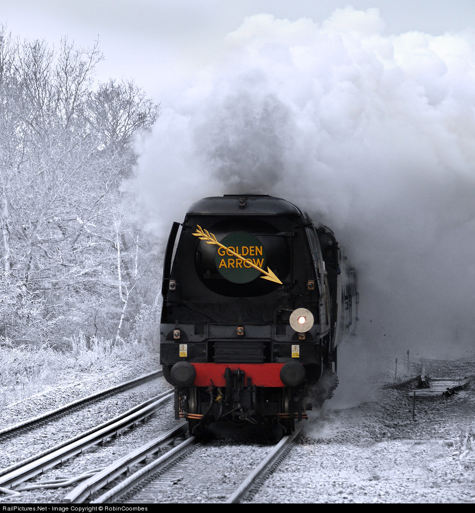 With the landscape covered by a thick blanket of frost, West Country Pacific No 34067 Tangmere coasts through Godstone with the Goldern Arrow from London to Folkstone Harbour