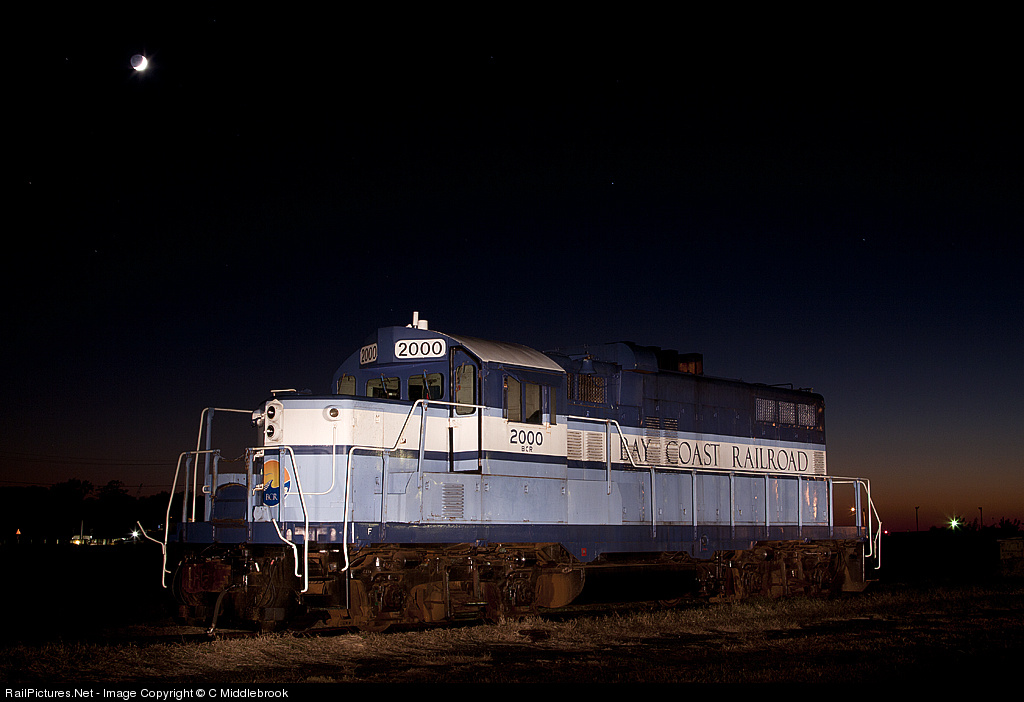 | Bay Coast Railroad Engine #2000 takes a well deserved rest under the moonlight and stars on a beautiful November evening. This GP10 locomotive was built in January 1957 for the Illinois Central Railroad as a GP9 power unit with the road number #9250. It also served on the Illinois Central Gulf roster with #8250. Prior to the Bay Coast Railroad acquiring this unit, it operated as part of the Eastern Shore Railroad with roster #2000. |