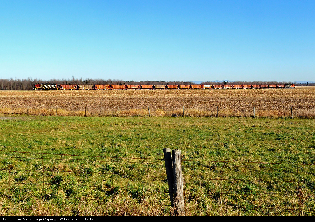 Work train 913 is dropping ballast along the Swanton Subdivision near the Canada/U.S border