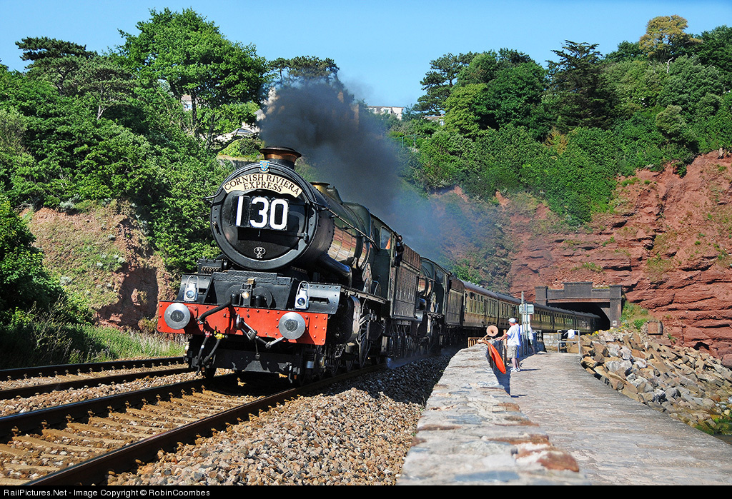 | Classic view, classic train. The Cornish Riviera Express double headed by GWR King and Castle locos No 6024 King Edward I and No 5029 Nunney Castle sprint along the sea wall between Dawlish and Teignmouth on a sunny June afternoon recalling the great days of the steam hauled holiday express. |