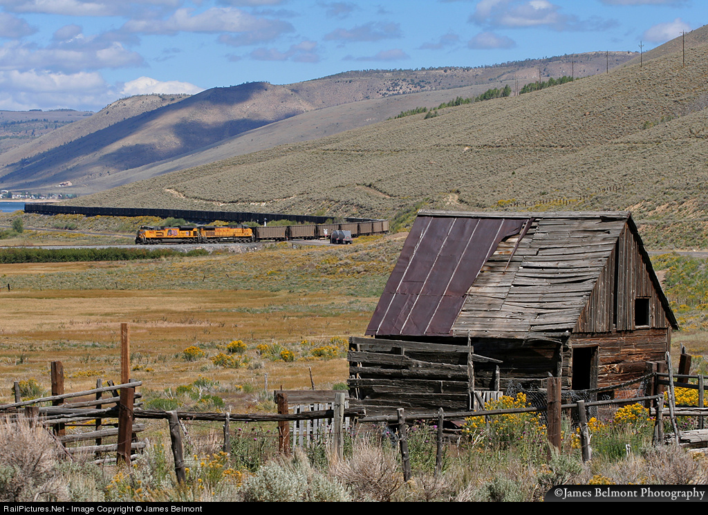Union Pacific's Valmy, NV to Skyline, UT coal empty rambles through pastureland along UP's Pleasant Valley Subdivision approaching the small town of Scofield.