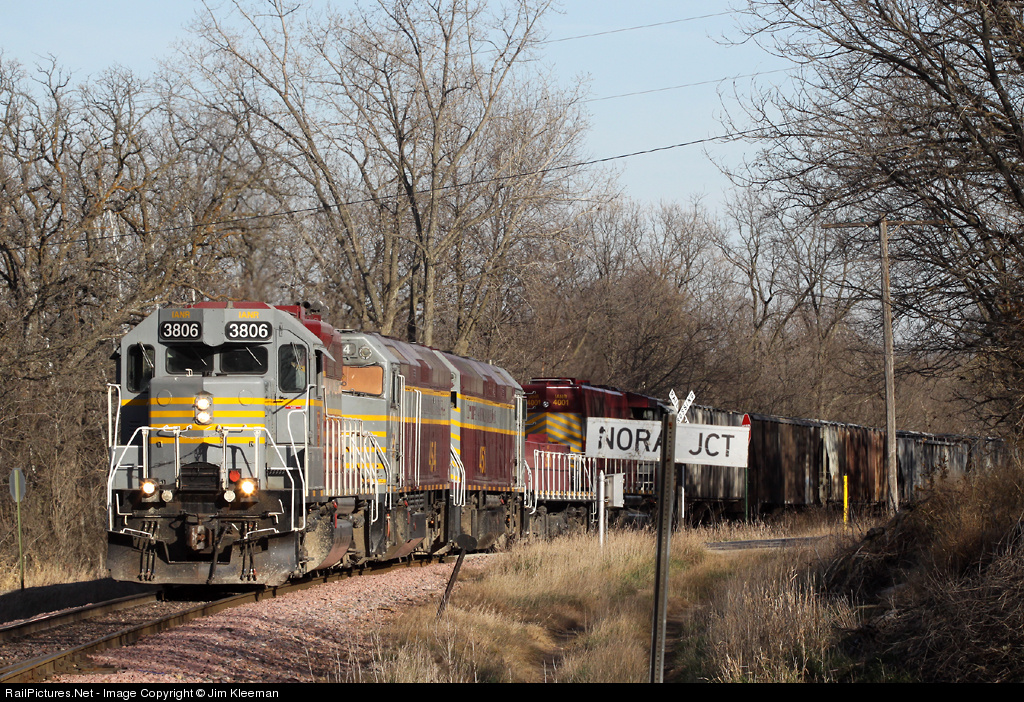 The North Job is on ICE/CP tracks switching at Nora Springs. Soon it will enter the connecting track at Nora Junction and return to home rails. The consist includes a GP38-2, two F40M-2Fs from the Canadian American Railroad, a road slug, and a GP40-2LW.