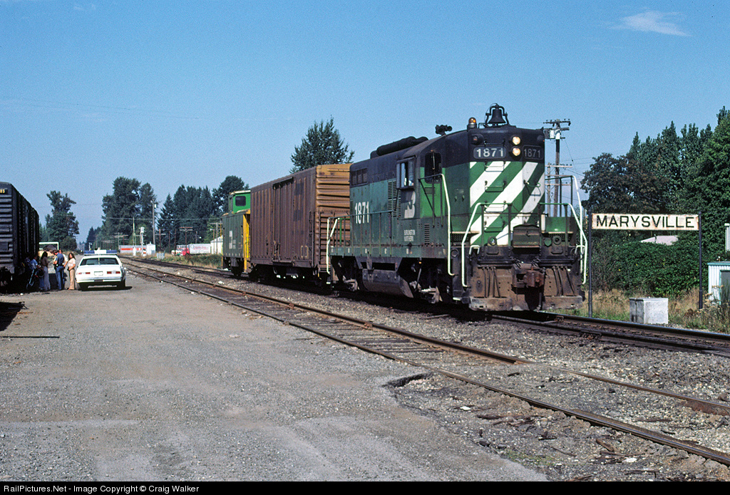 | The bell atop the short hood of Burlington Northern GP9 1871 is a dead giveaway that this is a former Northern Pacific engine (NP's 248). The local gendarme doesn't even look up as this single car train (not counting the caboose) passes by on its way south in Marysville, Washington, on September 18, 1979. |