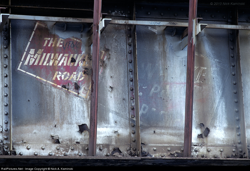 A Tale of Two Heralds... Undoubtedly, those involved in the Railroading avocation who have ever visited Tacoma are well aware of the Milwaukee heralds (on the left) that adorn a plate girder span of the L Street Bridge. They have stood as well preserved relics since the Milwaukee retreated from it's Pacific terminus in March 1980. However, the focus of this study is the faint, larger herald on the right, that has slowly revealed itself from obscurity within the last ten years. The older CMSTP&P heralds once stoop proud, along with the slogan "Air Conditioned - Route of the Olympian-Hiawatha," where that great train's western terminus was but five blocks west of this location. It is likely that sometime shortly after passenger operations were moved to the Tideflats, in April 1954, that the older heralds and slogan were covered over and replaced with the newer version. Ironically, a near fifty years after the last scheduled passenger train crossed the L street bridge, the silver paint fades to reveal the original decor. An irony, since Sound Transit begins regional commuter service over the same stretch at this juncture in time. A strange coincidence? For a 1940's photo of the original heralds and slogan please check out A NORTHWEST RAIL PICTORIAL, VOLUME II (ISBN 0-915713-22-5) by NW rail historian Warren W. Wing. Scanned From Transparency: Kodak KM 25