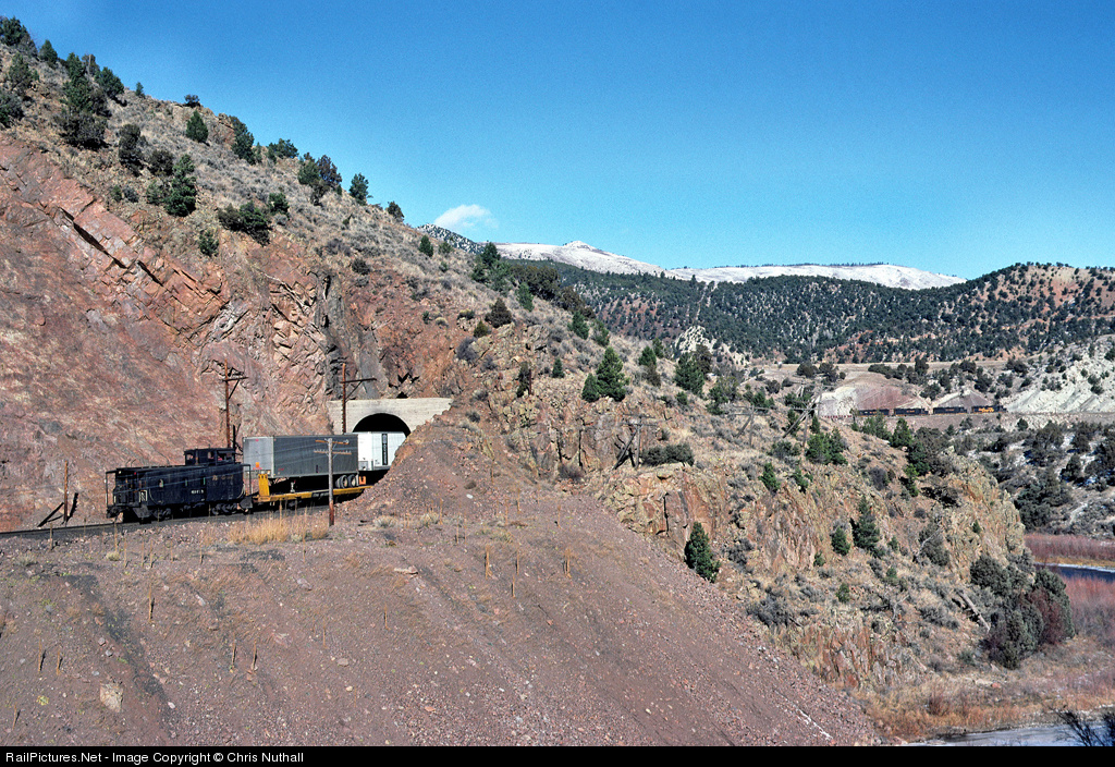 The twists and turns of the Colorado river are evident as an eastbound freight disappears into Tunnel 42 at Radium as its head end reappears in the distance climbing up towards Little Gore Canyon, in December 1981. The line up was 3128, 3071, 3068 and 3059, with caboose 01453.