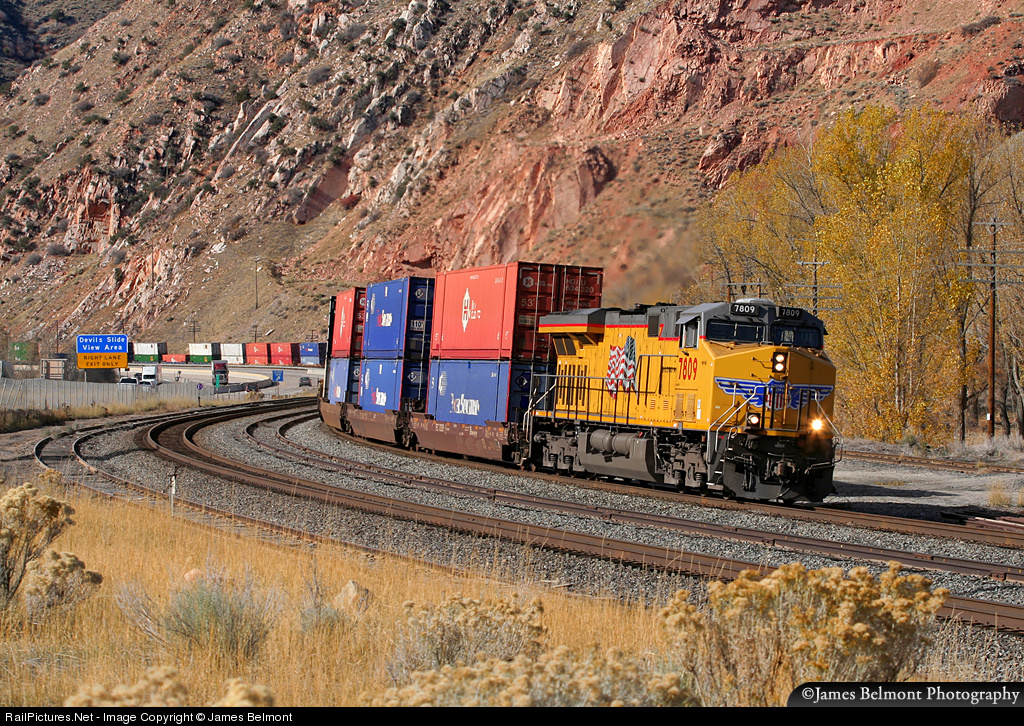| A short Oakland, CA to Marion, AR stack train curves through reverse super elevated curvature at Devils' Slide, Utah. |