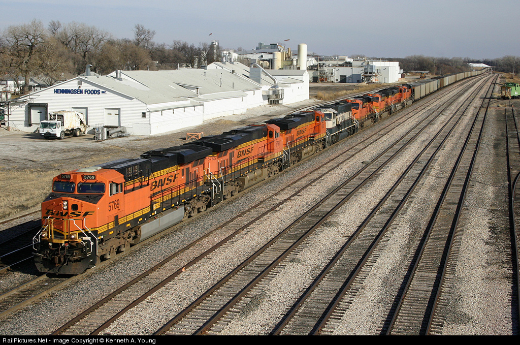| BNSF 5769, 5760, 6292, 9546, 5794, 5608, 9397, and 6403 bring 113 empties into Ravenna, Nebraska. On the rear end was DPU BNSF 6156. |
