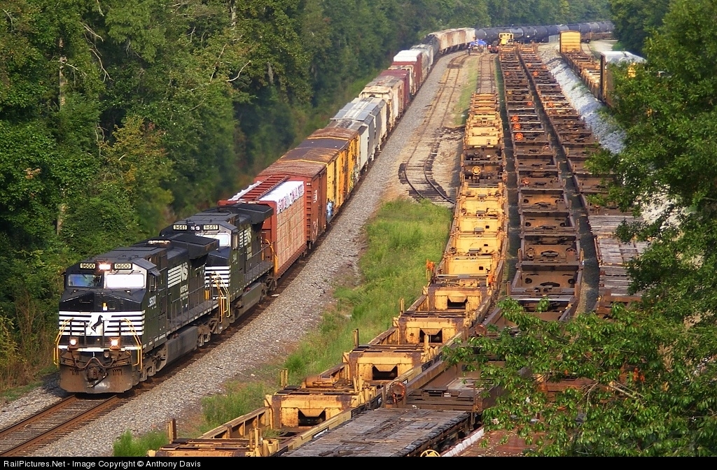 | A RARE LOOK! NS 156 is seen passing through the TTX Car Repair Shop Yard in Hamburg, South Carolina. What makes this a rare happening is that trains usually don't run in the right light through here, but NS 156 on this day was running a tad late. ALSO, Note 1 of the 2 GE 44 Centercabs that TTX owns can be spotted in the photo as well! Access to the TTX plant itself is nearly impossible since it is heavily guarded by security WITH dogs so this is the only spot (located off the I-520 overpass) where one can see any sort of view of the Yard. |