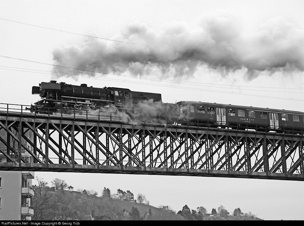 | Former Deutsche Bundesbahn 2-6-2 steamlocomotive 23 058 of Eurovapor is crossing the rhine between Feuerthalen and Schaffhausen with a train from Romanshorn.
