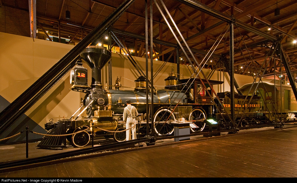 V&T Survivor: GENOA The California State Railroad Museum is fortunate to have 3 of the 9 surviving Virginia & Truckee Locomotives in its collection. The one seen here is Number 12, Genoa, a classic 4-4-0 American, built for the line in 1873. With her tall drivers, Genoa was faster than most of the line's other locomotives, so most of her assignments were passenger and mixed trains. She served faithfully until 1908, when she was retired and squirreled away in a stall in the line's large, Carson City engine house. There she sat for the next 30 years, covered and protected by those who understood her value. Finally, in 1939, she was sold to the Eastern Railroads Presidents' Conference and began a second career as a showpiece and excursion engine. She appeared at the 1939-1940 New York World's Fair and several rail-related events and celebrations over the next 40 years. She even stood in for the long-scrapped Central Pacific Jupiter at the Centennial of the Golden Spike Ceremony in 1969. Her last operation was in 1979, just before she was rolled into the CSRM, where she remains theoretically operable today. She is displayed on an 1884-era cast iron railroad bridge, coupled to a wooden combine and restored to her 1902 appearance with a sunflower-style stack.