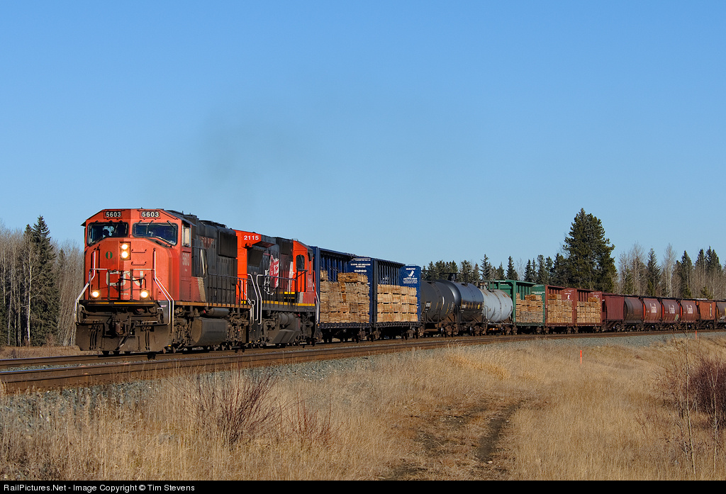 CN SD70I 5603 and C40-8 2115 lead Chicago to Prince George manifest M347 into Edson on the north track.