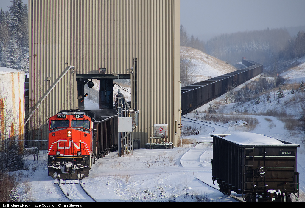CN 2244 begins to load 100 coal cars at Obed Mountain's loadout. CN 8892 can be seen on the tailend.