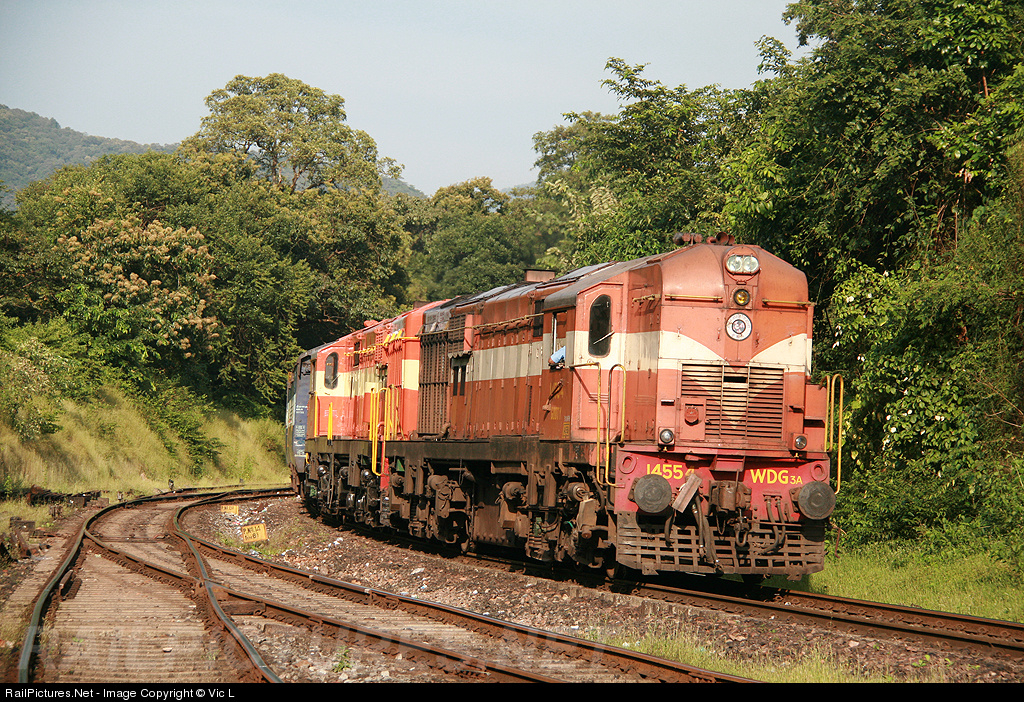 | A pair of DLW built (Alco powered) WDG3A's push train 7312 14h30 Vasco da Gamma to Chennai Express out of Kulem on October 28th 2010.