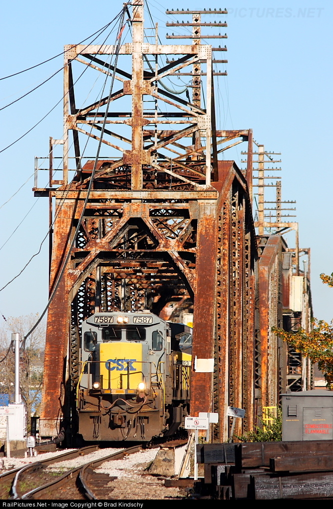 One of three C40-8s in stealth paint exits the Cumberland River bridge. When I first saw these units in 1989, I thought they were 100% ugly. Amazing how 20 years and a skosh of yellow paint can change your perspective.