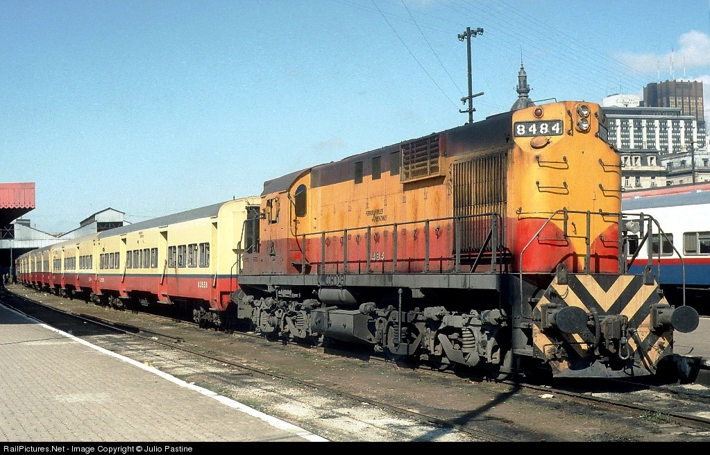 General San Martín Railroad's ALCo. RSD16 #8484 heads a six-car commuter train ready to leave Retiro Terminal. The General San Martín RR. operated its 75 RSD16's in all kind of duties: commuter and intercity passenger services, and merchandise, oil, wine, peddler and way freight. This interchangeability allowed enthusiasts the chance of watch certain gadgets not easily found in Buenos Aires, like the modified knuckle coupler applied to # 8484, which both served as a pure knuckle in oil-train consists with tank cars fitted with knuckle couplers, and as a hook-and-screw coupler by means of the retracting chain hanging from the knuckle side.