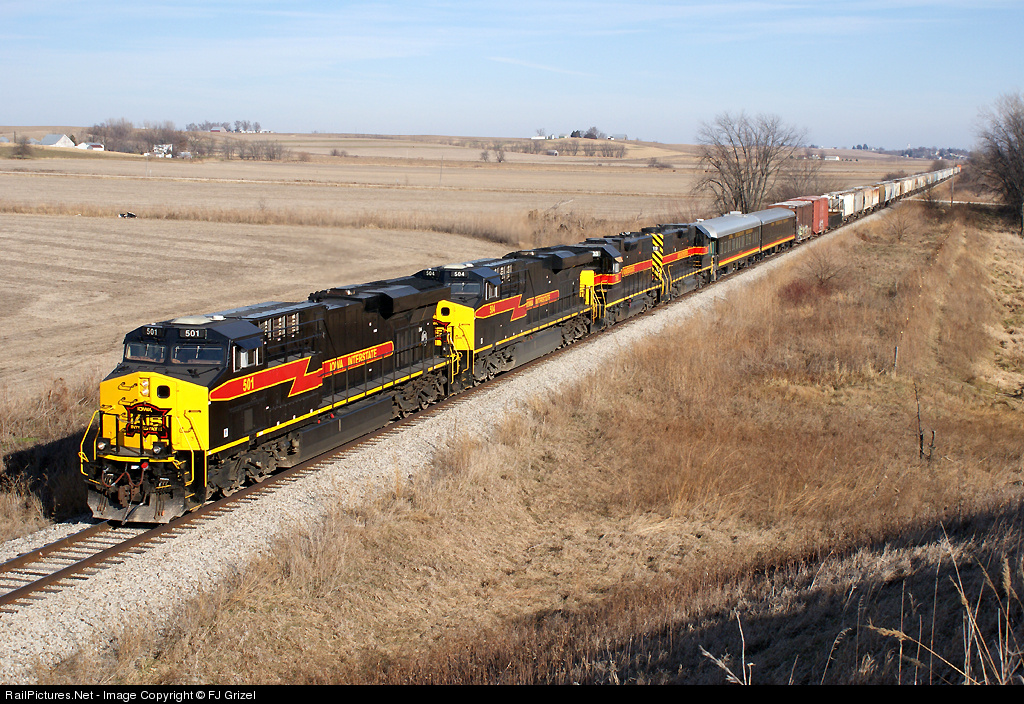 The late afternoon sun shines on GEVO 501 as it leads the westbound BICB through the rolling Iowa countryside at MP 277. Iowa Interstate's two business car (Hawkeye and Abraham Lincoln), behind the power, are heading west for winter storage and overhaul.