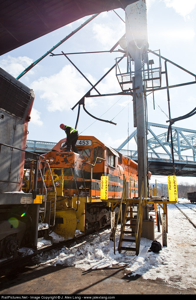 | B&P locomotive specialist Tim Ross sands the B&P 453 at Butler, PA's facility as part of the regular servicing routine for road power there. The set will head north on the BTRI to Punxsutawney the following day. For more, see my article in Trains Magazine's LOCOMOTIVE special issue (September 2010) |