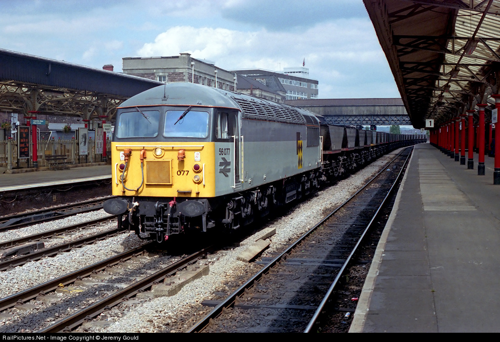 | 56077 heads west through Newport with a rake of empty HAAs. It was unusual to see a Toton based 56 in South Wales at the time and I can only assume it was transferring the HAAs from the Midlands. |
