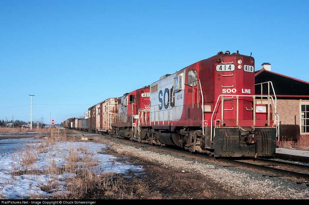 | Deep in the Soo era in Upper Michigan a pair of geeps, 414,401 power a short 15 car train 12 past the depot in Rudyard. The agent had been moved out long before and the building was surviving as a structure used by MOW forces. It would last through the end of the Soo and into the early WC era before finally being torn down. |