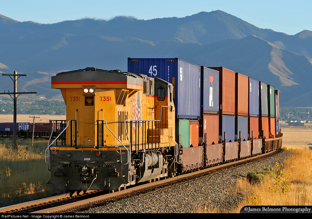 | A distributed power pusher on UP's Global 3, IL to Long Beach, CA stack train grinds slowly west along the Lynndyl Subdivision approaching Erda. The city of Tooele is visible in the distance along the foothills of the Oquirrh Mountains. The UP 7351 and train have more than 750 miles of trackage to cover to reach the Port of Long Beach in Southern California. |
