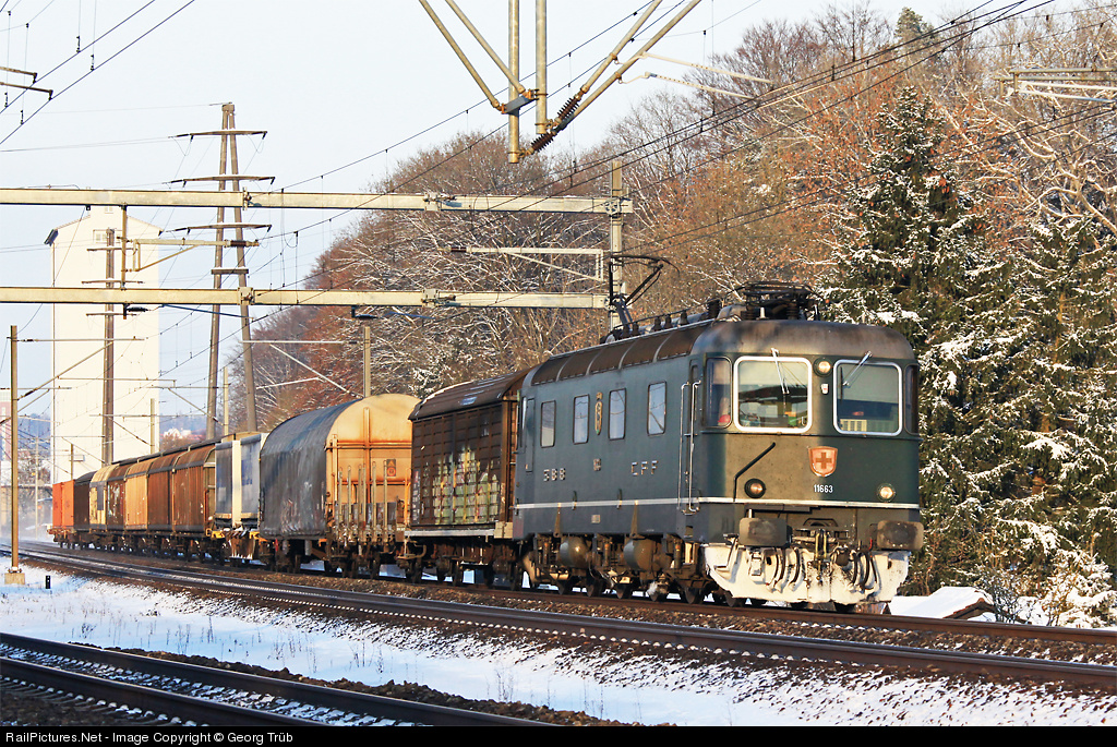 | Re 6/6 11663 "Eglisau" in the classic green color with the little round lower headlights is pulling freight train 65550 from St.Gallen freight yard to Limmattal shunting yard. |