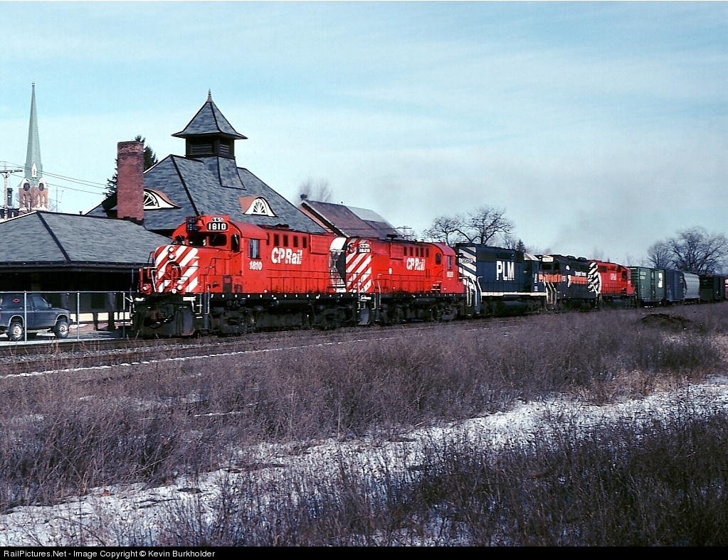 A day after Christmas in 1991, CP Rail's Mohawk to Binghamton, NY train 270 is seen passing the Cobleskill, NY station with five units in five paint schemes: CP RS18u 1810 (Large multi-mark), CP RS18u 1829 (no mark), PLM SD40 3003, ST SD26 619, and CP SD40-2 5677 (small multi-mark). Scanned from my Kodachrome 25 slides.