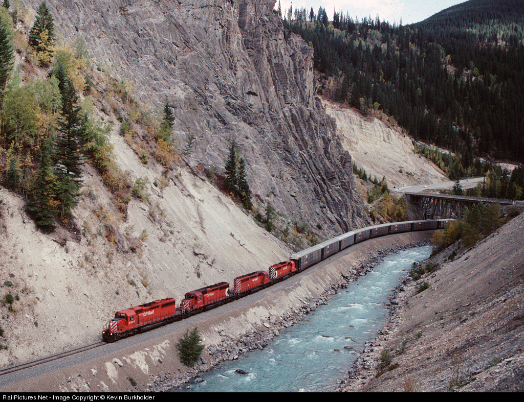 Running parallel to the Kicking Horse River, CP train 481-11 - nearing the home stretch on the Montreal-Vancouver trek - is passing through Ottertail, BC with SD40-2s 5902, 5872, 5703 (blanked windows and LocoTrol II receiving equipment) and the 5933. Scanned from my Kodachrome 25 slides.