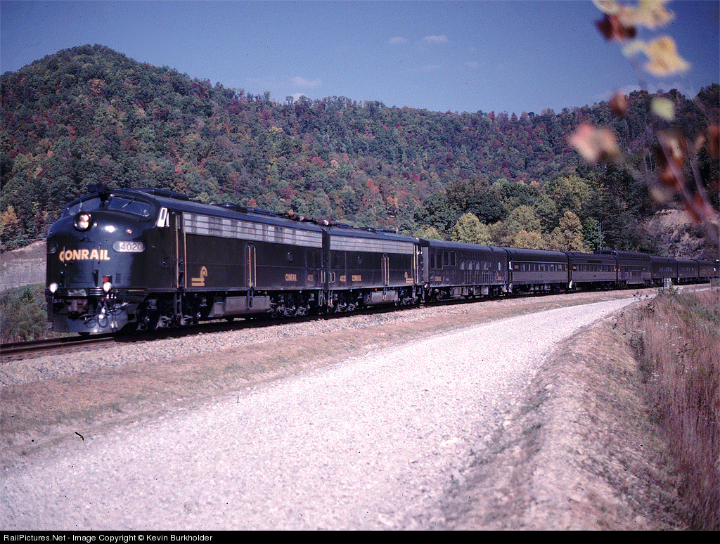 | Conrail's office car train - running as OCS-601 - pulls through the loop track of the High Power Mountain Mine at Summersville, WV on a crisp October day with E8As 4020 and 4021. Scanned from my Kodachrome 25 slides. |