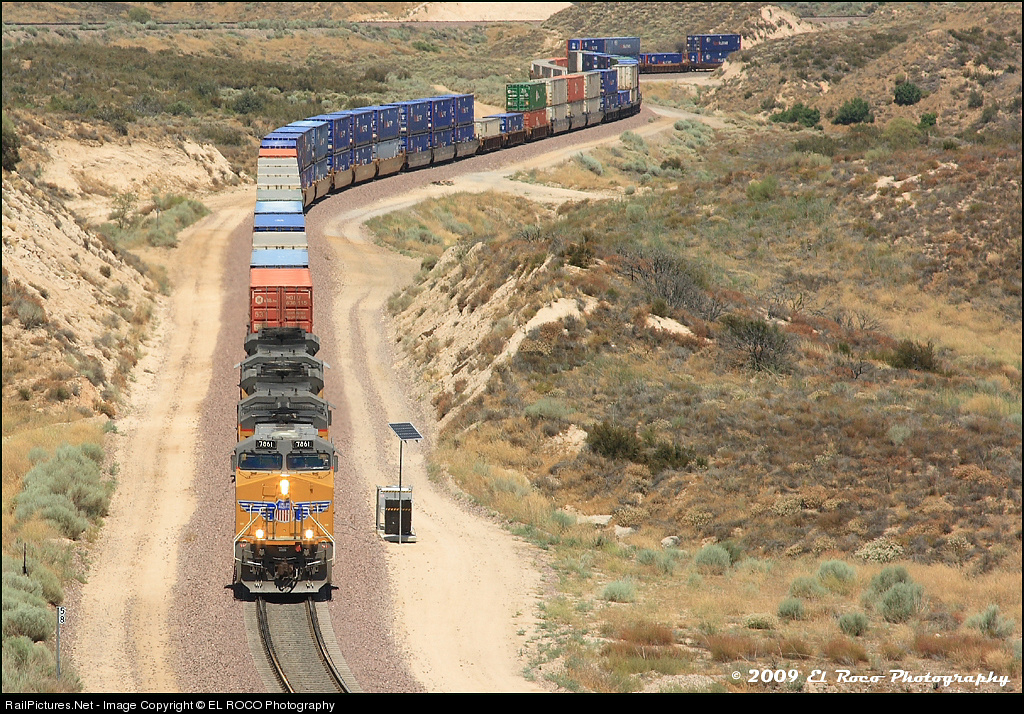 | With a Rumble and a Squeal - A Westbound stack train with mid-train DPUs slowly makes its way down the Cajon Pass on Main #3, here crossing U.S. Forest Service Road 3N46 at MP 58 near Hill 582. |