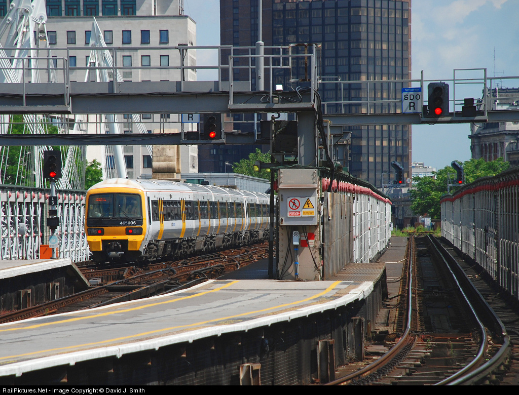 | A class 456 unit heads away from Cannon Street station,crossing the River Thames on a local working to the South London suburbs. |