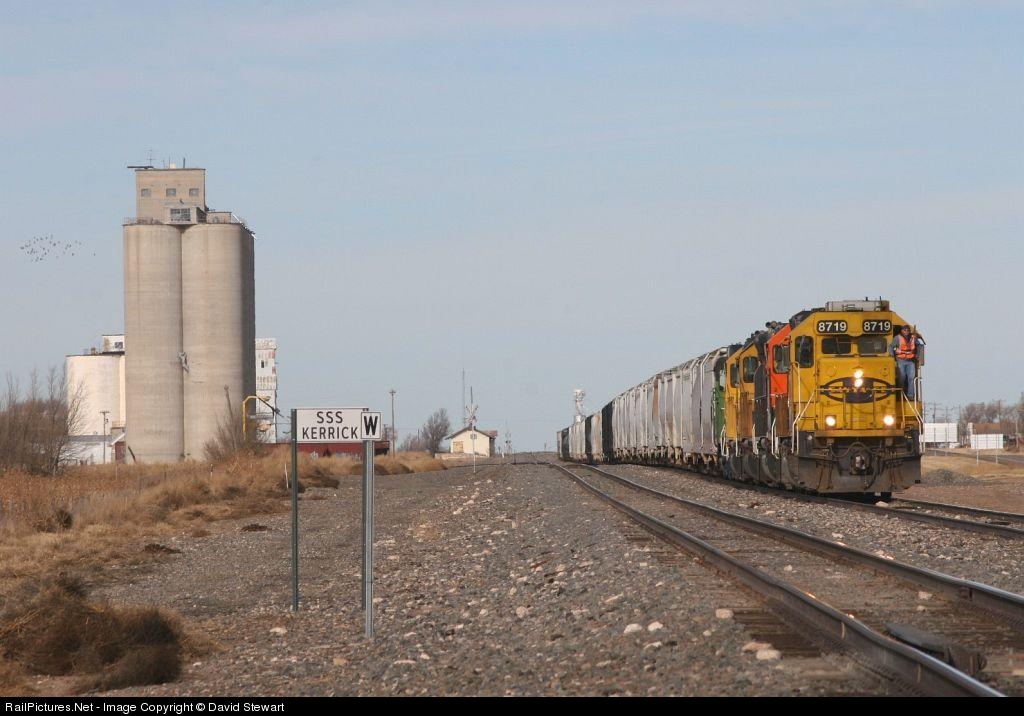 | BNSF GP60 8719 south leads two SD40-2s, GP39-2, GP38 and a GP39M through Kerrick Ok. |
