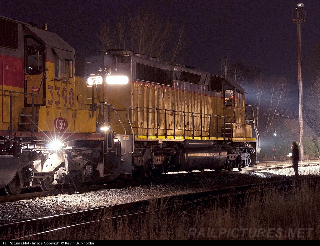Having arrived in White River Jct., VT with switching work at hand, the conductor has just aligned a yard switch and is now examining his switch list in the light produced from the FEC SD40-2 722 and trailing unit, CEFX SD40-2 3398.