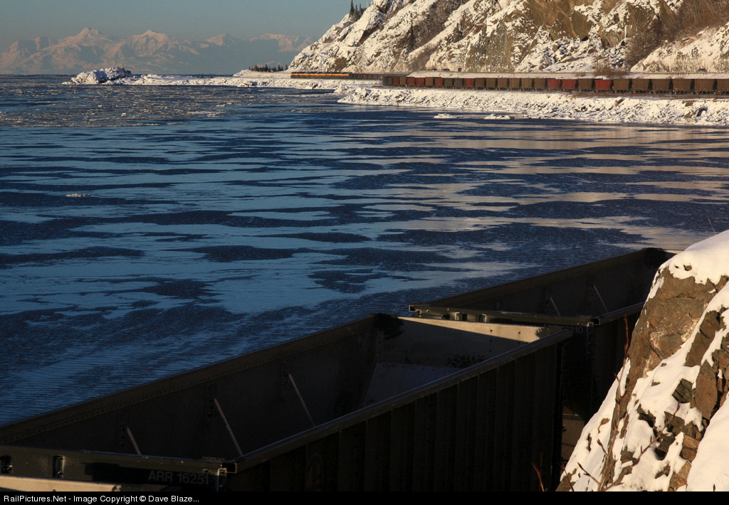 Big Time Coal! 10 units - count 'em - curl north with 113 empty coal hoppers along the icy shores of Turnagain Arm beneath the snowy peaks of the Chugach Mountains. This is by far the largest unit train ever run by the ARR. It is, in fact, 1 ½ normal trains. Two days prior day high winds had shut down dumping operations in Seward with one train only half empty. The road crew turned out with 4 units and half the train. Meanwhile, the following day the other consist (ARR has two 75 car unit coal trains cycling around the clock) showed up. It was dumped successfully and doubled up with the other half still in Seward and came north to Anchorage as a monster train stretching 7000 ft in length that you see before you! In the distance over 50 miles distant rise the massive 12,000+ ft peaks of the volcanically active Alaska Range on this spectacular day in the Last Frontier.