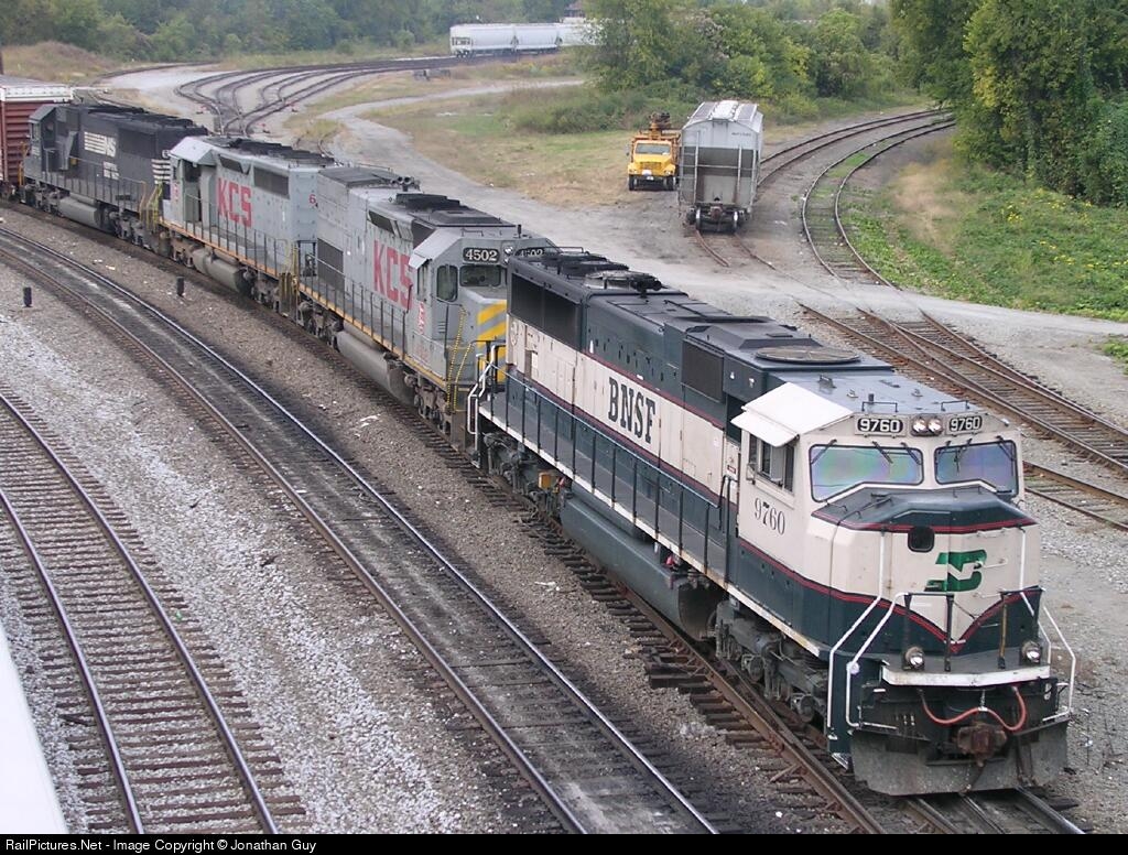 A colorful EMD quartet with BNSF 9760, KCS 4502 and 6614 with NS 6629.