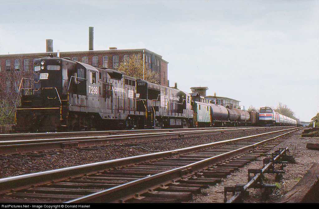 | Day after day the same group of locomotives showed up at Attleboro. They were either u-boats or GP9s still wearing PC colors hauling for Conrail. Notice Amtrak sneaking up beside headed for Boston. My location at the time I took this shot was a dangerous place to stand and clearly on railroad property. |