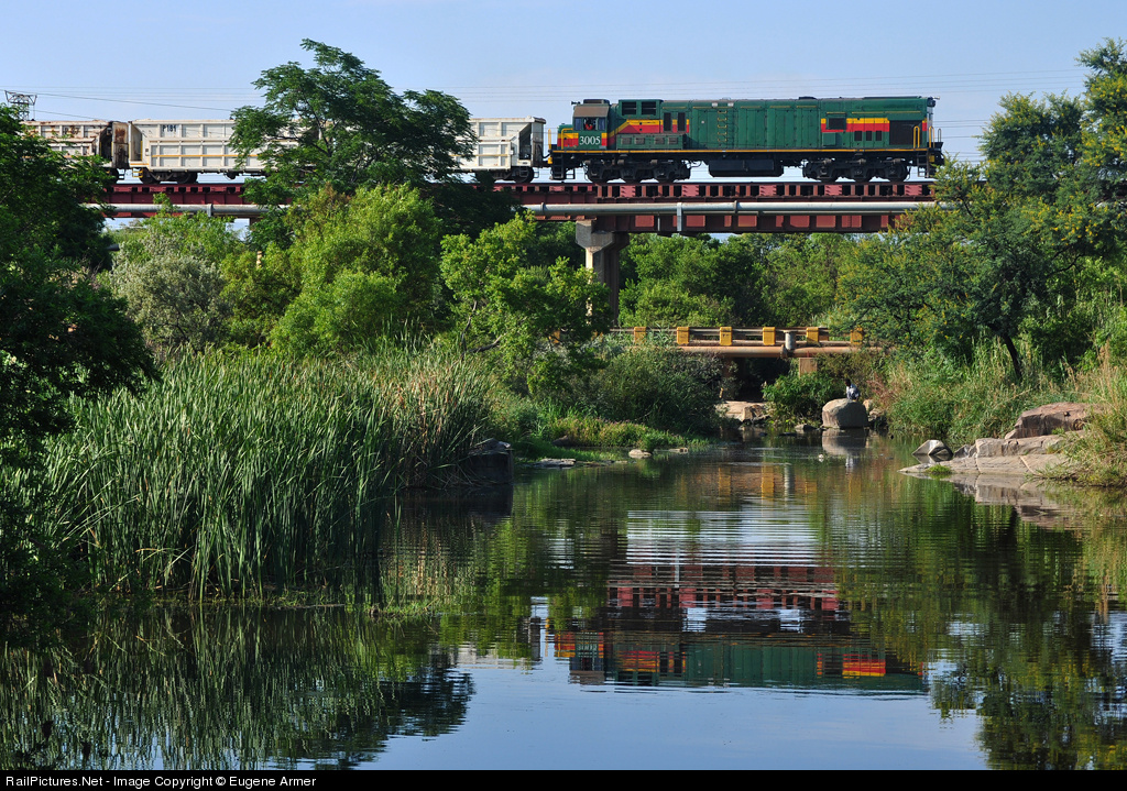 All the locomotives on Anglo Platinum's Rustenburg system face the same direction, which means that all empty trains are hauled long hood forward, such as this one. Ex-Sheltam C30 # 3005 is crossing the Hex River, heading west to Townlands for loading.