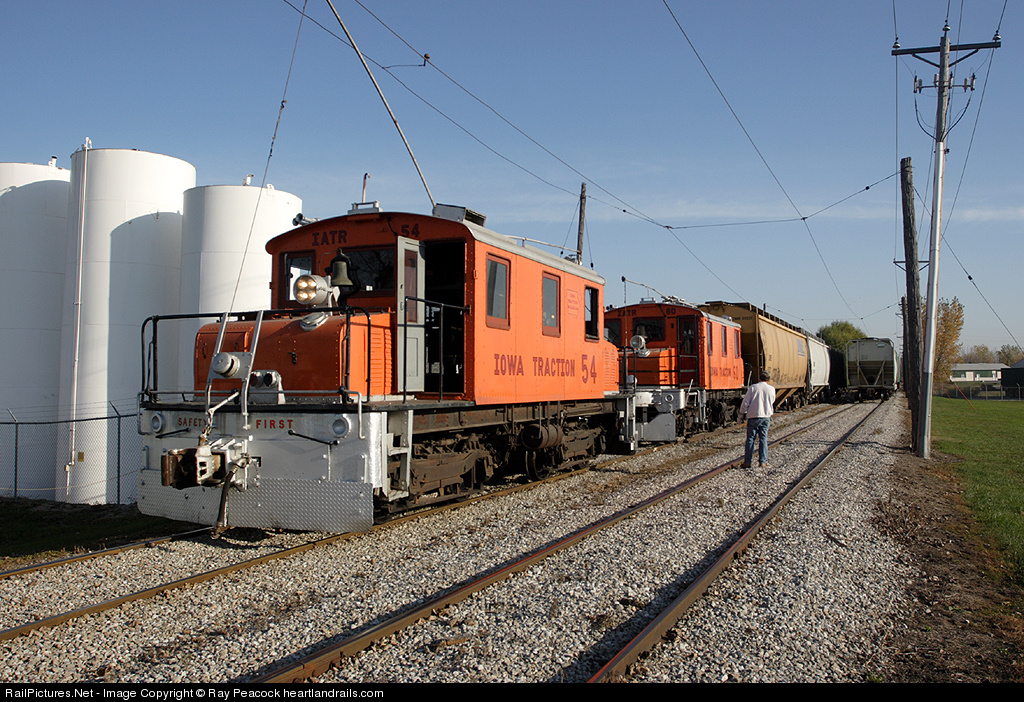 | Another timeless workday on the Iowa Traction begins with a pickup off the ICE interchange (seen on the right track), motor #54 with it's distinctive headlamps backs into the siding where sister #60 waits with additional cars. A very quiet operation, reminded me of my mother's sewing machine sounds from when I was a kid. |