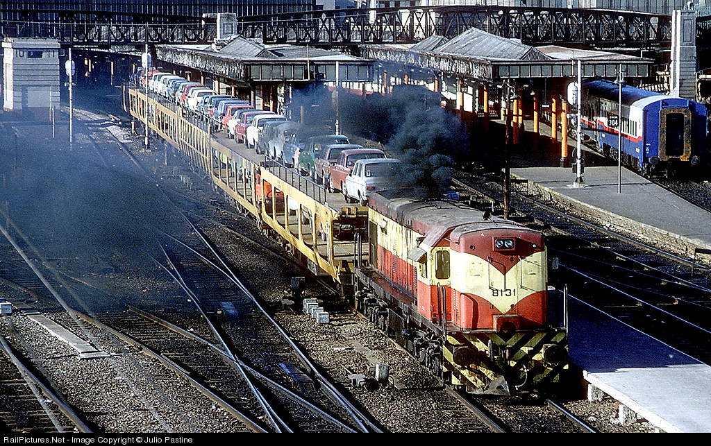 General Roca Railroad's General Electric export-model U18C #8131 fills the surrounding air with a cloud of thick oily smoke while moving a cut of bi-level auto-racks away from Platform 12 of Plaza Constitución Terminal. Cars with automobiles have arrived with train number 4002, the all-stops Mar del Plata to Buenos Aires local that carries vacationeers' autos from their holidays in the seashore resort city 400 km. to the south of Argentina's Capital City. ¡Pity the poor owners of the automobiles loaded in the first auto-rack, they will get their cars back with a sooty cover of combustion residues of half-burn fuel, carbon and oil!