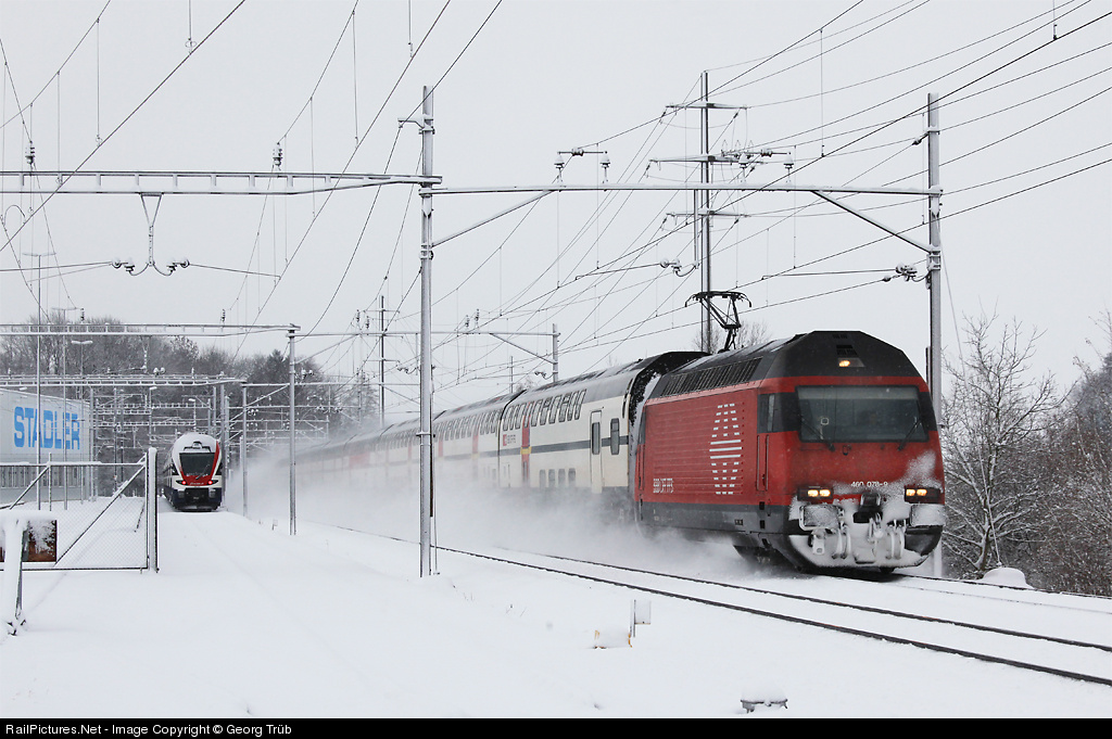 | Re 460 078 is passing the new Train Comissioning Centre (IBS) of Stadler Rail with InterCity 826 from Romanshorn to Brig. RABe 511 001 trainset is waiting for test runs in the afternoon. Re 460 078 is the former mySwitzerland.com publicity locomotive and has a video camera in the cab. |