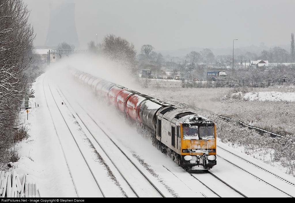 Winter has finally come to the Thames Valley after hitting just about everywhere else in the UK hard over the last 2-3 weeks. Despite the appalling conditions (by UK standards) train 6B33, the Theale - Robeston empty tanks is running on time behind 60054 (the last Class 60 still in original livery). The effect of the weather on the local road system can be seen on the right hand side of the shot with nose to tail traffic going nowhere fast