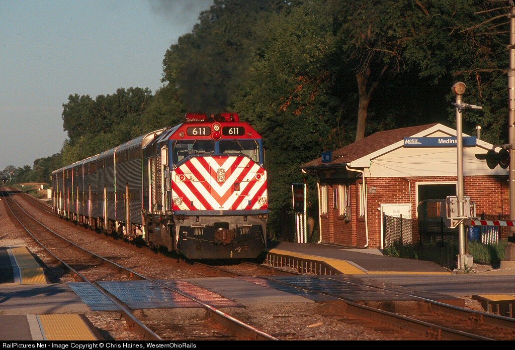 | Metra F40C 611 throttles up after a stop at Medina, IL as it trails its train for the trip back downtown. |